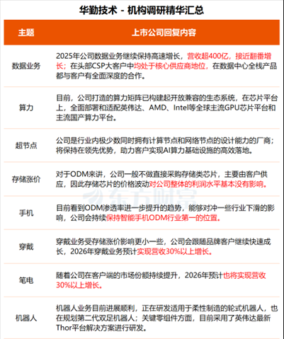 机构预测,华勤技术2025年公司数据业务继续保持高速增长,营收超400亿,接近翻番增长;在头部CSP大客户中均处于核心供应商地位,在数据中心全栈产品都与客户有全面深度的合作,并且2026年预计继续增长,笔电业务全球份额进一步提升。