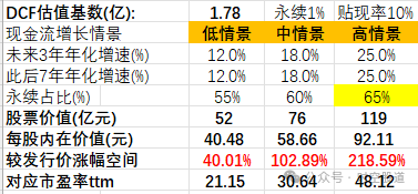 DCF绝对估值:偏低(发行价低于低增长情景内在价值)
