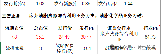 *首日涨幅预测*:公司发行价24.49元适中,流通市值7.8亿元适中,发行市盈率30倍适中偏低(PEttm22.8倍,申万化学制品行业约23.8倍,主要可比公司卓越新能28倍)。整体看中规中矩,发行层面没有特别大亮点,又有卓越新能的市值帽子(总市值63亿)可能影响涨幅,不过另一只比卓越新能和发行人各方面业绩都差的多的可比公司嘉澳环保,市值就达到了72亿,这个市场就是这么扭曲。综合研判,预计首日收盘涨幅区间80%-180%,对应股价约44-68元,对应市值约63-98亿元(需结合上市日市场环境);如涨幅低于60%,个人会进场做风险套利。