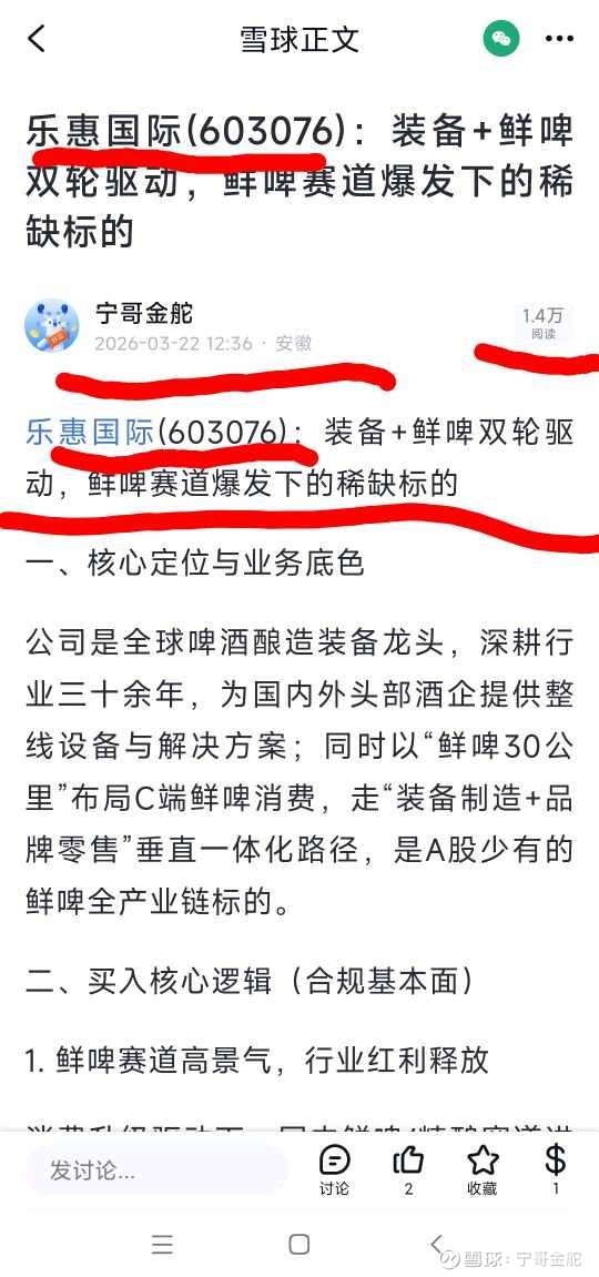 #乐惠国际 #鲜啤赛道 #啤酒装备龙头 #价值投资 #雪球实盘