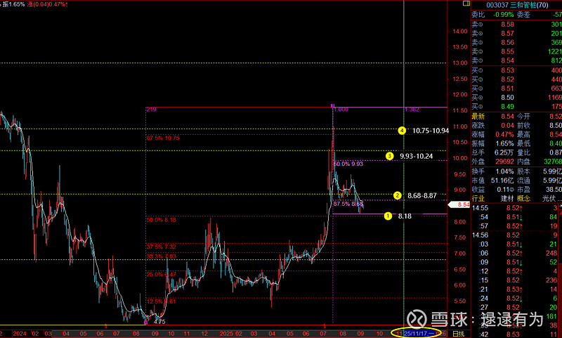 $三和管桩(SZ003037)$ 单边下跌,abc小结构挺好,空间超跌,时间还不到。当前支撑8.18,空间阻力8.68-8.87、9.93-10.24、10.75-10.94,接下来强度比较关键。