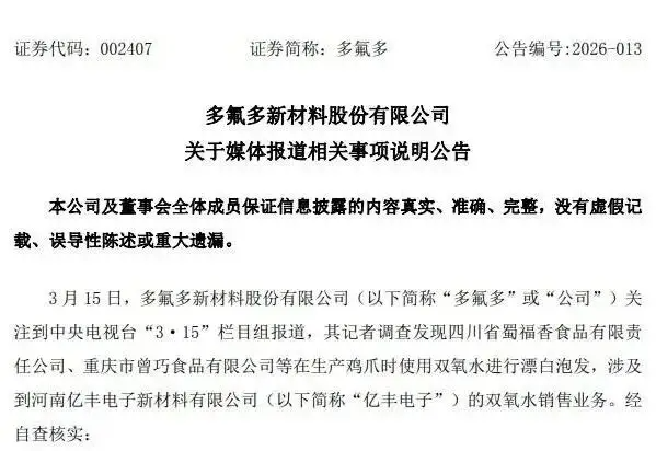 3月16日早间,多氟多发布关于媒体报道相关事项说明公告称,3月15日,公司关注到中央电视台3·15栏目组报道,其记者调查发现四川省蜀福香食品有限责任公司、重庆市曾巧食品有限公司等在生产鸡爪时使用双氧水进行漂白泡发,涉及到亿丰电子的双氧水销售业务。
