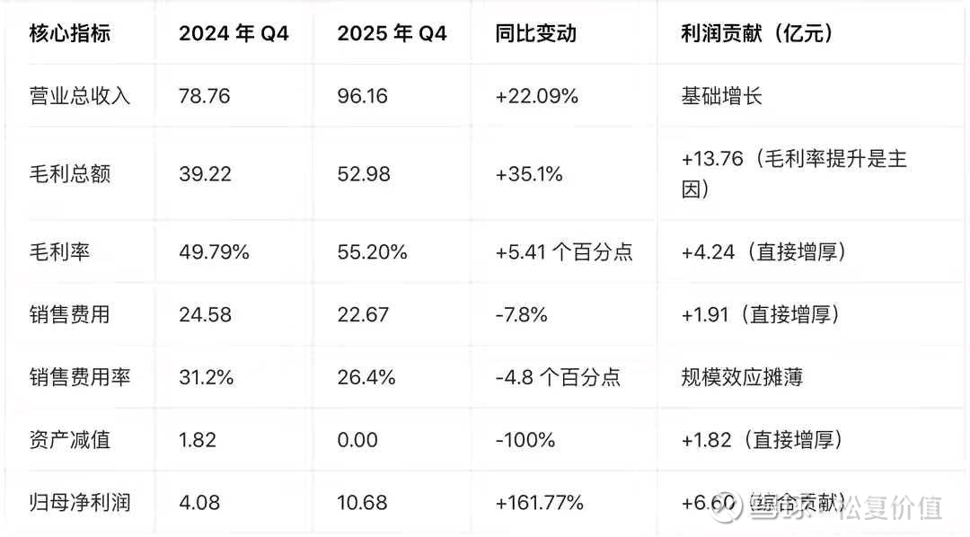 (3)减值归零:2024 年 “大洗澡” vs 2025 年无大额计提,2024 年 Q4:计提存货跌价 + 商誉减值合计 1.82 亿元,直接侵蚀利润,2025 年 Q4没有这项,仅此一项带来 + 1.82 亿利润差额