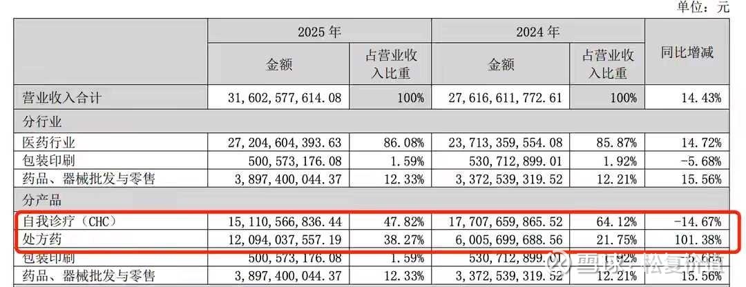 1、增收不增利原因分析:天士力并表带来营收大增,但核心 CHC 业务受 2025 年的呼吸道疾病发病率回落、线下药店客流承压影响,收入同比下滑 14.67%,并购带来的学术推广、渠道整合投入推高费用,销售费用同比增长 25.88%,研发费用同比大增 81.90%,费用增速远超营收增速,最终导致利润增速远低于营收。