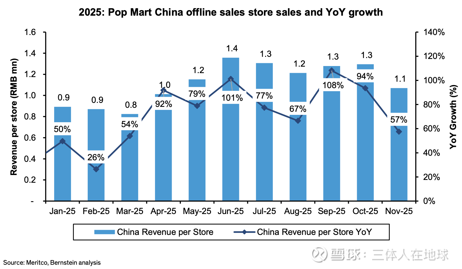 而通过这个数据,Bernstein分析出了这个2个主要的数据结果,一个是门店店效,11月的店效对比6月份有显著的下降;另一个是门店的坪效,11月的门店坪效对比6月份(以及他们虚空造出来的一个坪效基准)也有显著的下降。