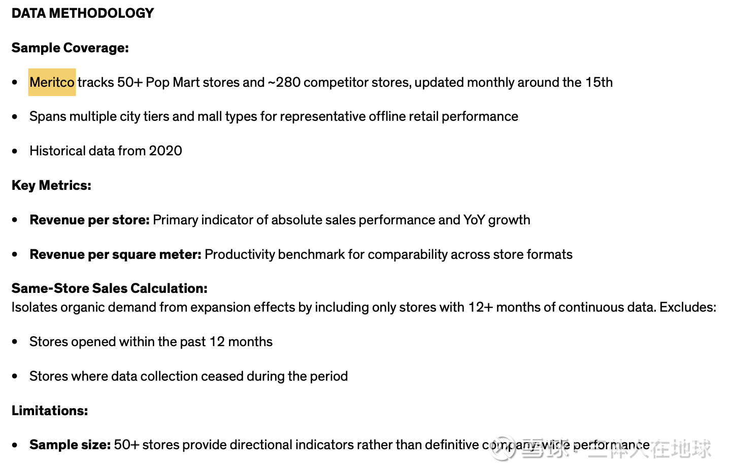 当然,机构要吃饭,这个都理解。虽然久谦在业内以压榨员工闻名,但现在大环境不好,老板也有不得不赚的钱。在Bernstein的报告里Methodology部分,有描述泡泡玛特国内门店数据的获取方法: