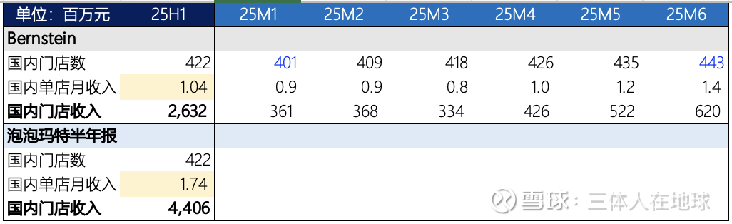 在Bernstein的报告里,已经给出了久谦调研的单店店效数字。此时我们要验证这个数的最佳方法,就是拿去和25H1公司财报披露的店效进行对比。一方面,我们用24年末的国内门店数作为1月份的门店数,假设门店数量逐月线性增长至25年6月的水平。之后我们用Bernstein报告逐月的店效数字乘以当月的门店数。最后,求出25H1的平均门店数以及总收入,相除得出久谦调研版的25H1平均门店店效。而另一方面,我们用25H1财报数据来计算这个时间段真正的平均门店店效。得出的结论如下: