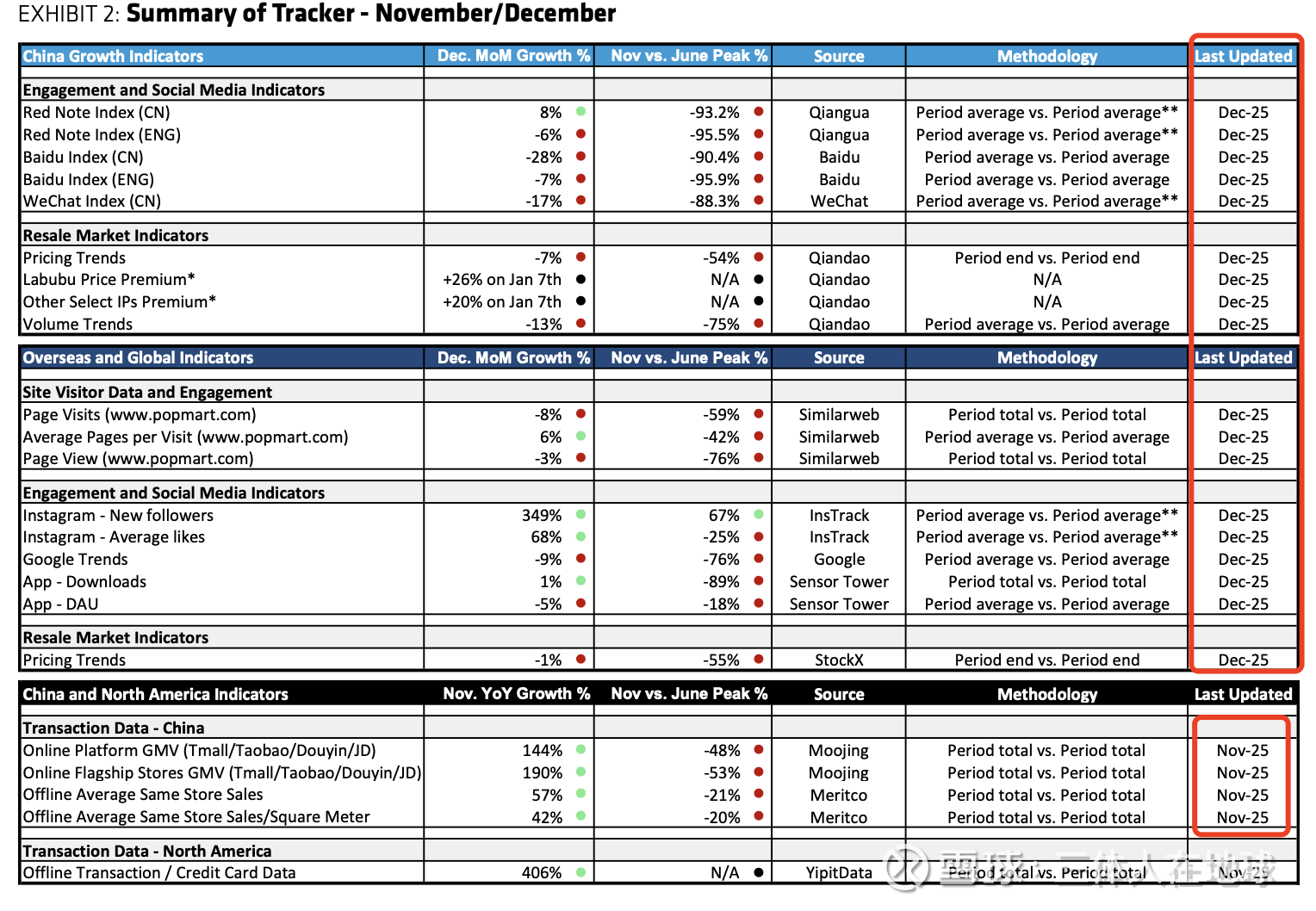 在报告1附录里,Bernstein罗列了所有空头数据的来源和时间维度,但其中有一个明显不合理的地方。这篇报告的发布是时间是26年1月13日,而除了上面提到的国内门店店效/坪效数据以及线上渠道的GMV数据更新日期是11月以外,其他的那些流量数据更新日期都是在12月。
