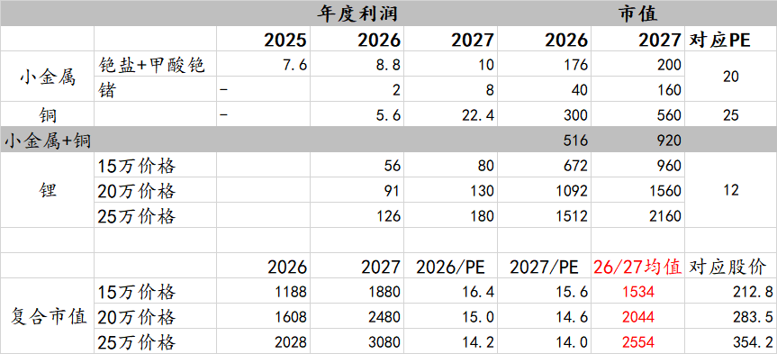 小金属,铜,锂分别按20倍,25倍,12倍PE进行折算,最后用总市值/全部产品利润,得到整体PE的区间为14-16倍,放在牛市环境中算是比较中等。牛市会提前兑现部分27年的市值,因此26年的估值中枢可以按26/27两年的均值作为参考。15-20-25万锂价时,对应的26年估值中枢分别为 1534亿,2044亿,2554亿,对应股价为212,283,354元。