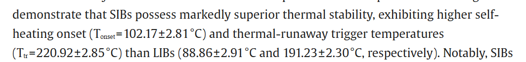 在明火事故中,安全性评价指标并不是电池本体储存的电能,而是电解液+塑料等聚合物燃烧释放的能量,根据OSTI文献,锂电每KG的燃烧能量在4-4.5MJ(百万焦耳);而钠电,由于技术路线决定了电解液高出60%,并且壳体/隔膜等可燃成本类似,因此每KG的燃烧能量与锂电相似。可参考ScienceDirect披露的文献网页链接,容器燃烧实验中,虽然二者的峰压不同,但是总能量释放是可比的。