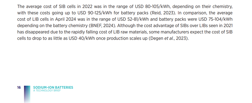 根据出处为专门吹钠电的IRENA 与中国电科院 CEPRI 联合发布的(钠离子电池:技术简报)《Sodium-ion batteries: A technology brief》。钠电2022年的系统报价为$90-125kWh。有杠精要说钠电为什么拿22年的价格出来比锂电24年的价格,你说为什么?因为这几年没降低,拿不出来数据啊!