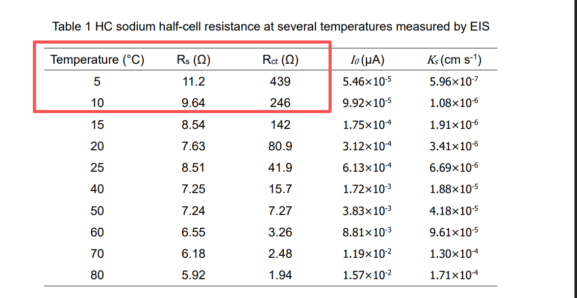 极端低温-20°时,RΩ增加倍率=4.9233/4.3943=1.12倍,Rct增加倍率=34.08/4.6=7.4倍,此时钠电等效增长应该在数百倍!