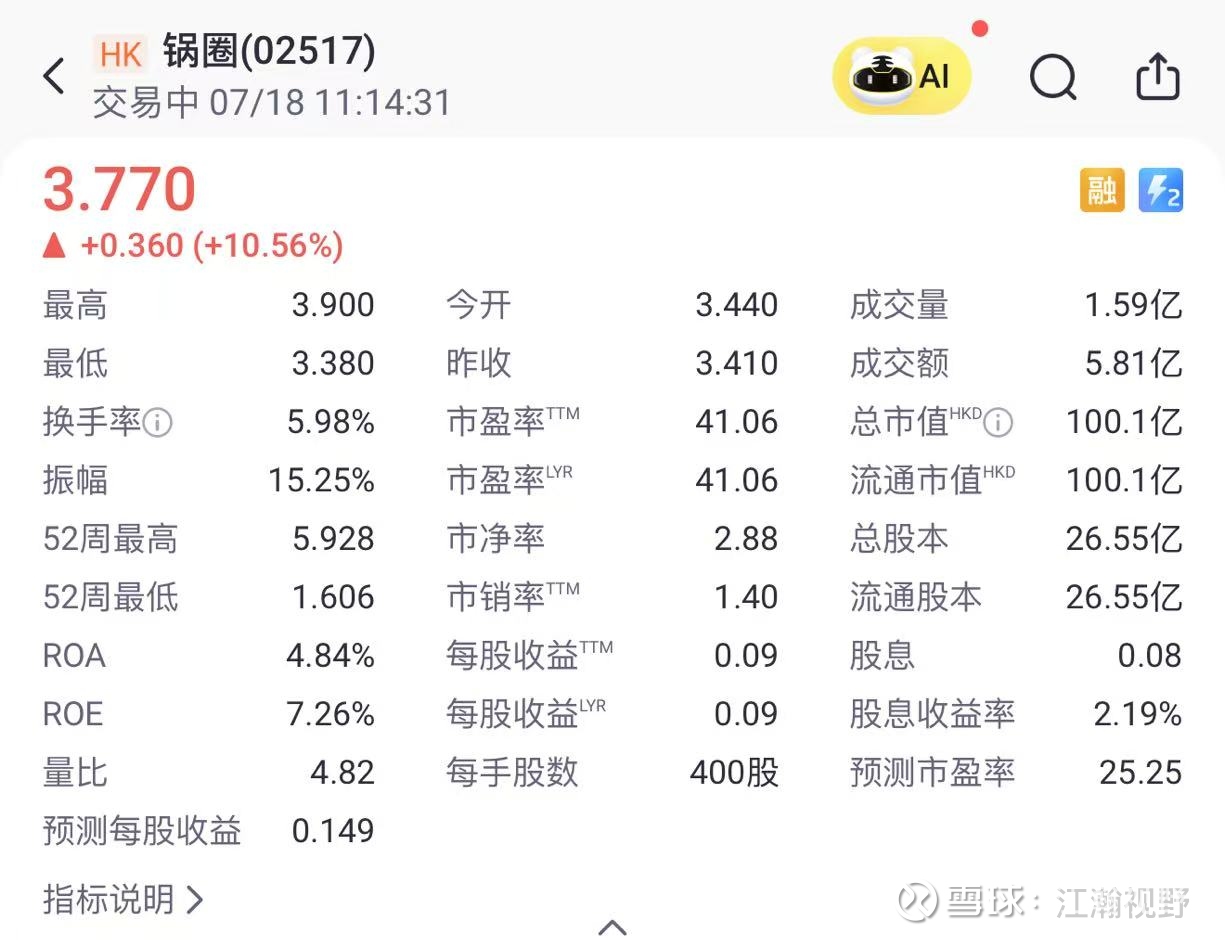 根据公告内容显示,锅圈今年上半年实现了高达三位数的净利增幅,最高增幅接近1.5倍。随着这一利好消息的发布,锅圈股价也随之上涨,整体市值重新回到百亿港币。