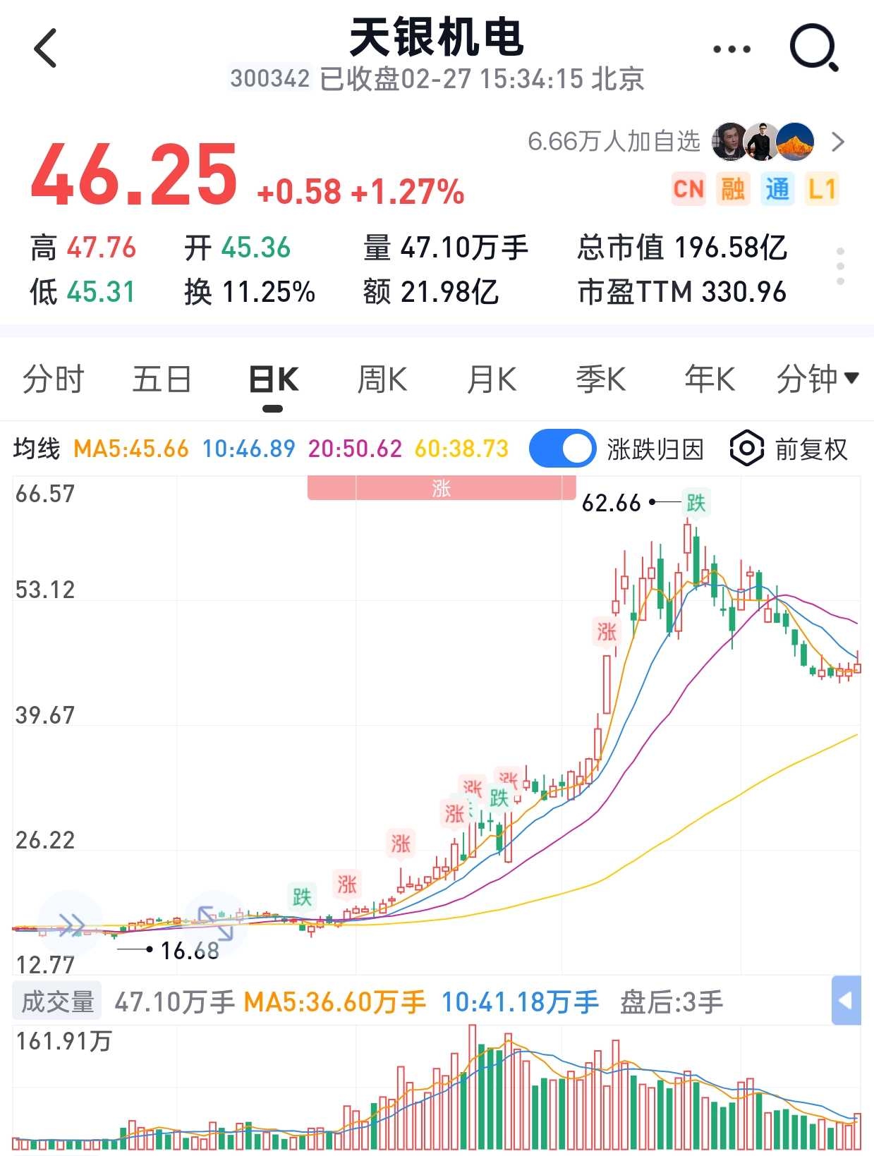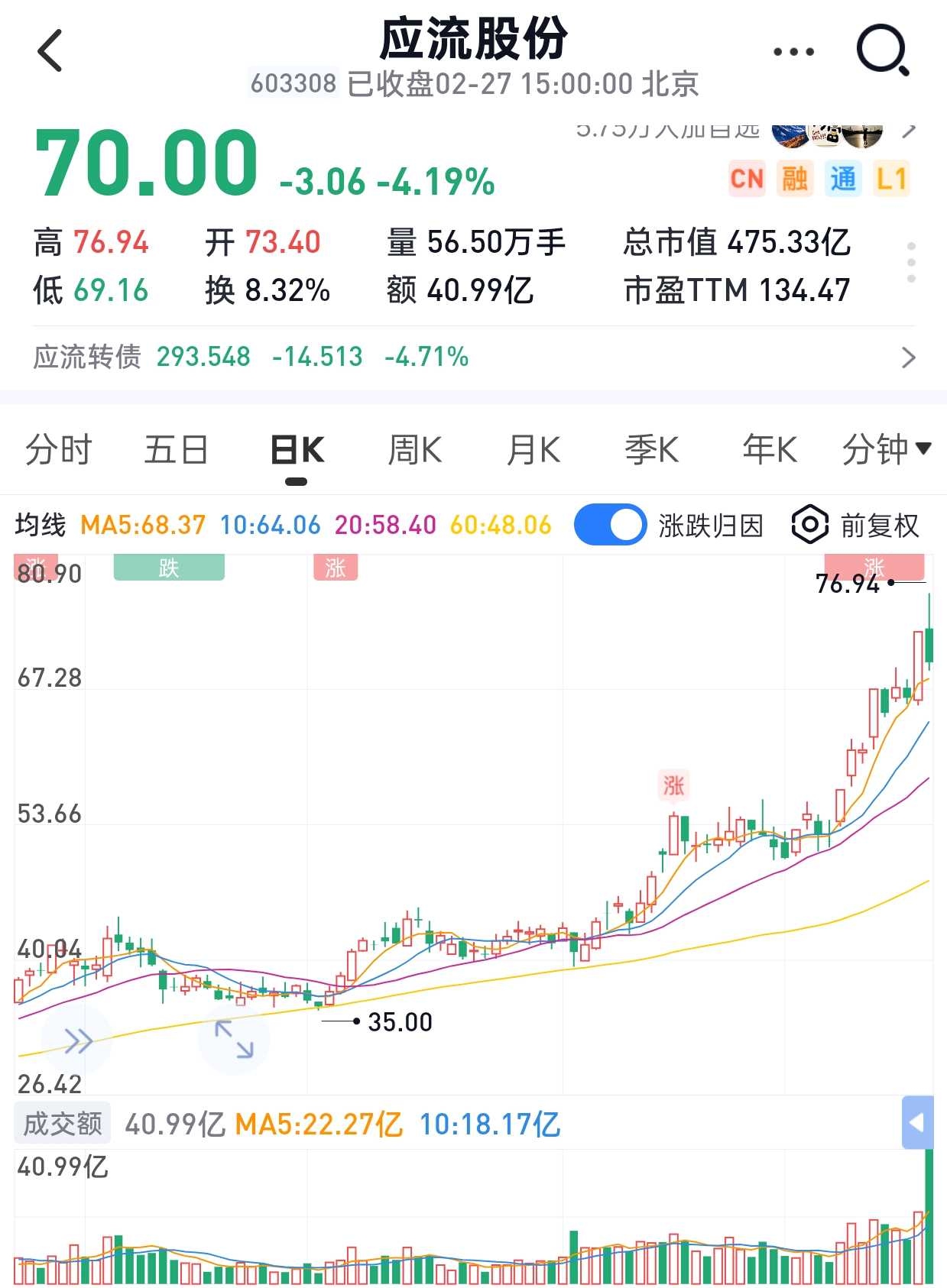 应流股份主营高温合金和大型铸件,据称是SpaceX的猛禽发动机融部分熔模铸件的供应商,但并未得到公司官方的直接确认。与春晖智控一样,应流股份的股价也属后发制人型的,近期更是得益于燃气轮机叶片的全球市场爆发。年初以来累计涨幅达到67.6%,2月当月涨幅36%。周五盘中历史新高后放巨量收阴,最新市值475亿元,调整压力似乎不小。