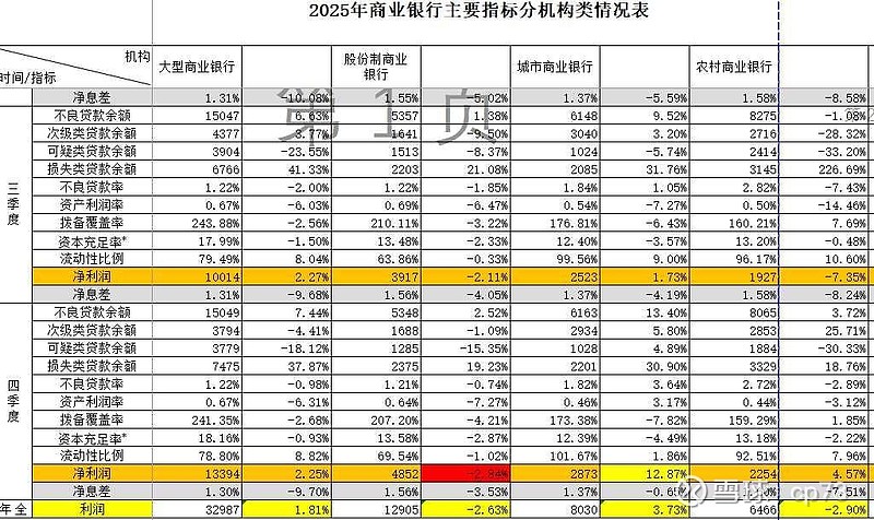 2025年商业银行主要指标分机构类同比情况表25年四季度城商行利润呈现出很强的边际比较优势。净息差边际下滑情况也相对较好。资本充足率边际下滑最多,说明存在以量补价,资产负债表扩张较快。大行四季度息差1.3%最低,下降也最快。$成都银行(SH601838)$ $江苏银行(SH600919)$ $招商银行(SH600036)$