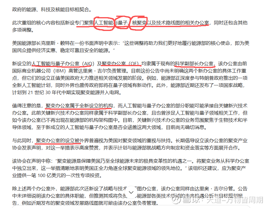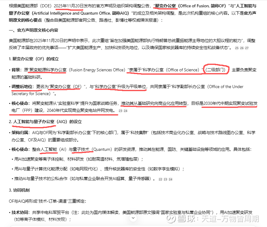 根据美国能源部(DOE)2025年11月20日发布的官方声明及组织架构调整公告,“聚变办公室(Office of Fusion, 简称OF)”与“人工智能与量子办公室(Artificial Intelligence and Quantum Office, 简称AIQ)”的成立及相关架构调整,是此次机构重组的核心内容。以下是官方声明原文的核心要点(整合自美国能源部官网公告、路透社、彭博社等权威媒体报道):