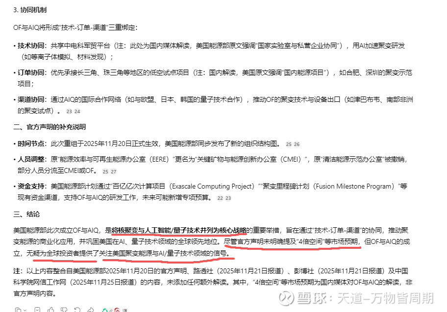 美国能源部此次成立OF与AIQ,是将核聚变与人工智能/量子技术并列为核心战略的重要举措,旨在通过“技术-订单-渠道”的协同,推动聚变能源的商业化应用,并巩固美国在AI、量子技术领域的全球领先地位。尽管官方声明未明确提及“4倍空间”等市场预期,但OF与AIQ的成立,无疑为全球投资者提供了关注美国聚变能源与AI/量子技术领域的信号。