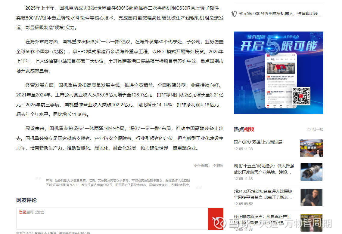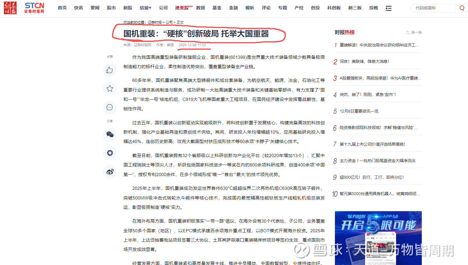 截取其中一段:“截至目前,国机重装拥有32个省部级以上科研创新与产业化平台(较2020年增加13个),汇聚中国工程院院士等顶尖人才,斩获包括国家科技进步一等奖在内的600余项科研成果,创造400余项“中国第一”,授权专利2000余件,在多个领域形成“唯一”“首台”“最大”的技术领先优势。”