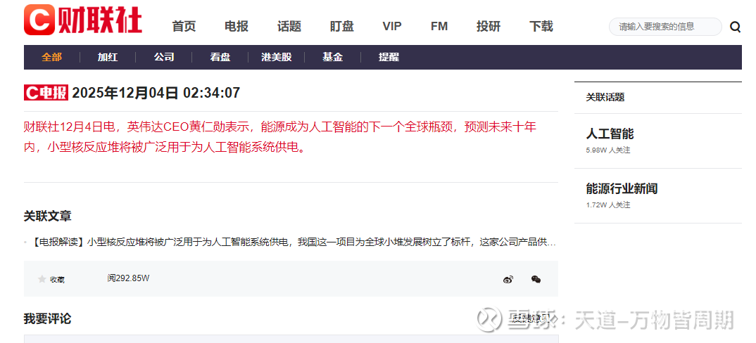 英伟达CEO黄仁勋12月4日预言能源将成AI发展全球瓶颈,未来十年小型核反应堆将广泛用于AI供电,这一言论带动12月5日美股Oklo、NuScale Power等核电概念股暴涨超10%,全球资本确认了AI+核电的逻辑有效性。