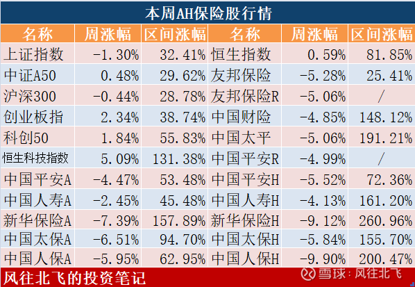 本周保险板块跑输大势。AH两市清一色下跌。本周板块内涨幅最大的个股是中国人寿A,周涨幅-2.45%。