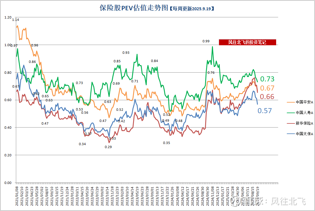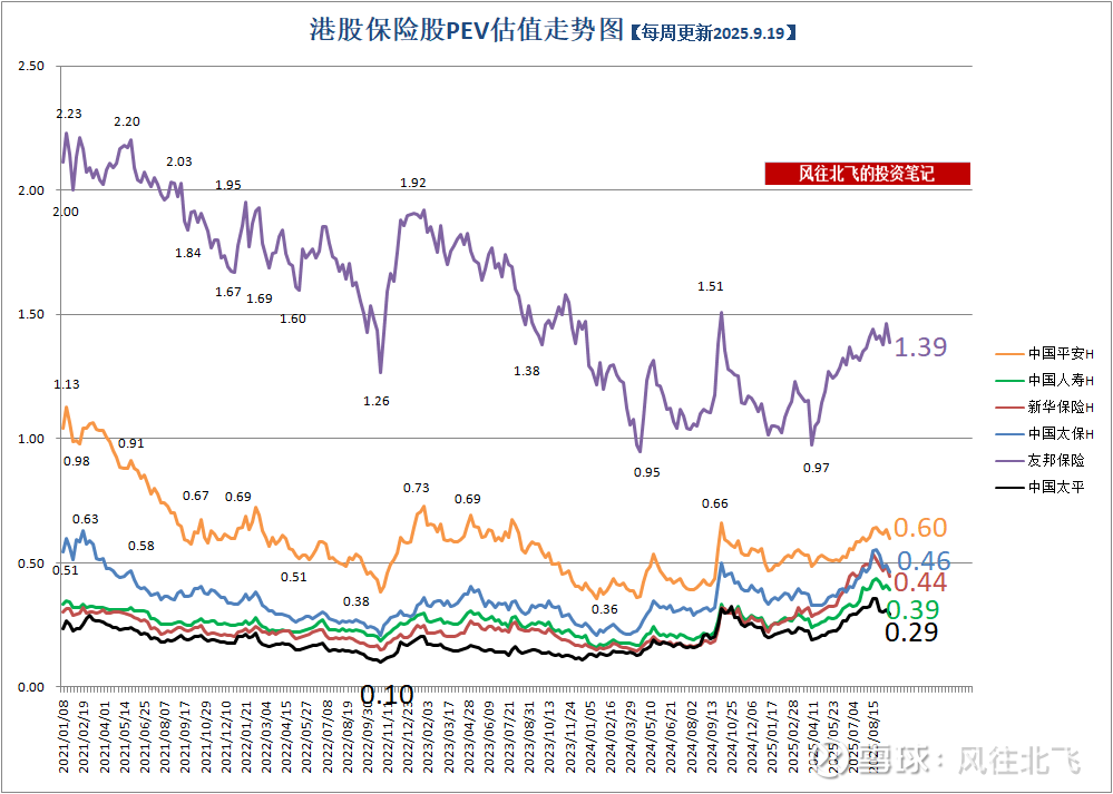 风往北飞的“保险股黑板报”每周更新。这里每周会更新保险板块的动态PEV走势图,今天是第246期。行业内主要公司的业绩报告也会第一时间写观察文章。