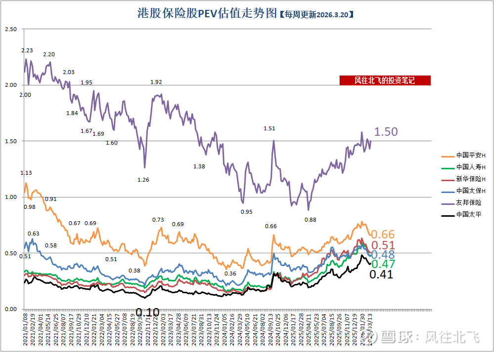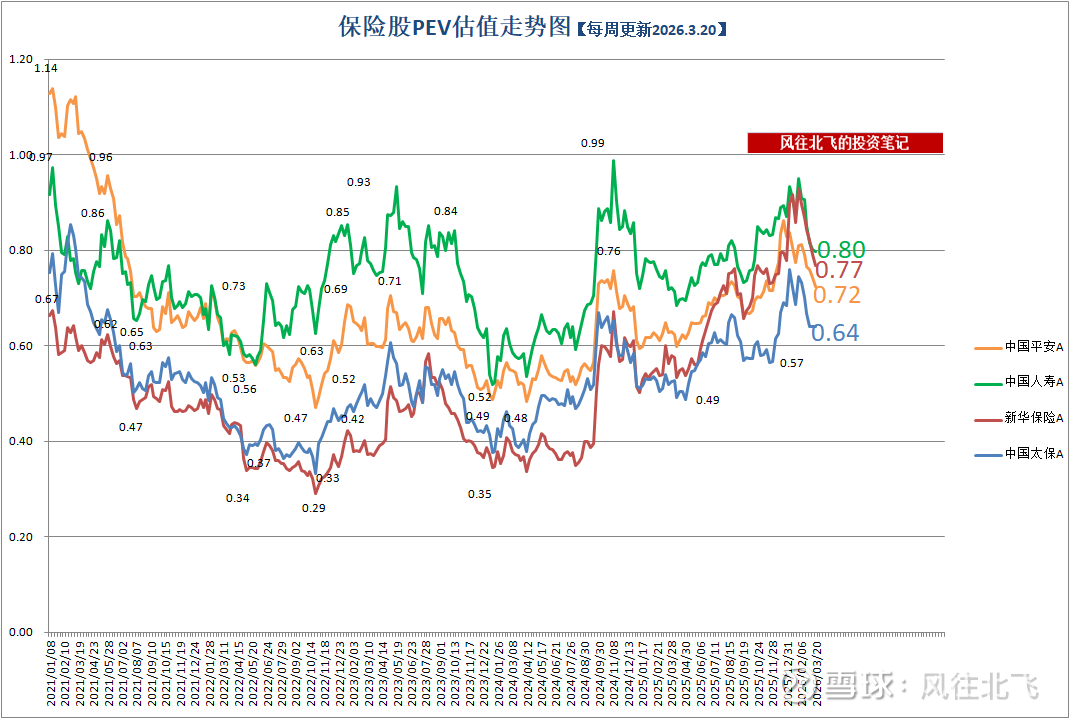 风往北飞的“保险股黑板报”每周更新。这里每周会更新保险板块的动态PEV走势图,今天是第272期。行业内主要公司的业绩报告也会第一时间写观察文章。