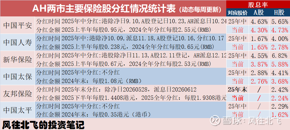 1、友邦保险、中国平安、中国人寿、新华保险每年两次分红。中国太保、中国太平暂时还是年末分红。