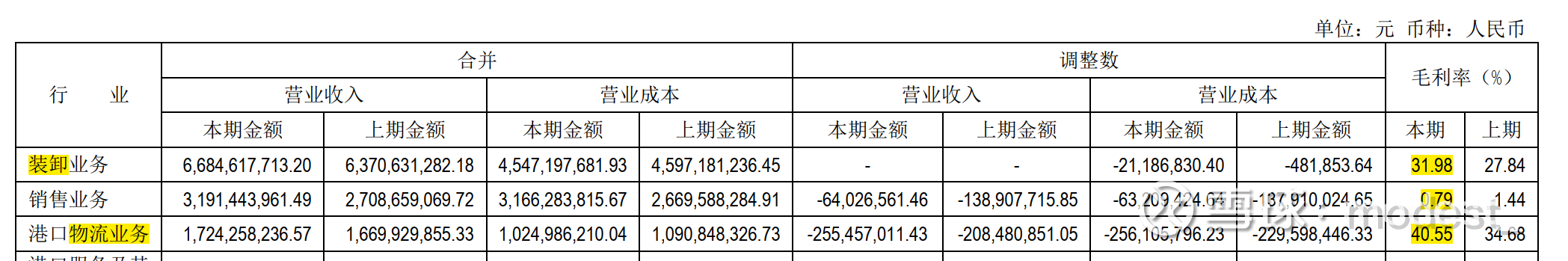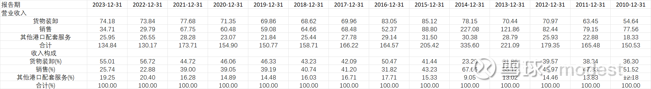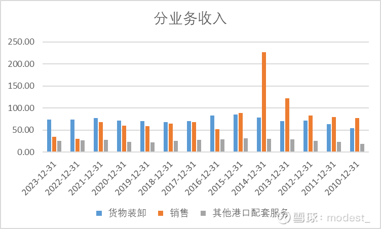公司的收入主要分为货物装卸,销售,其他港口配套服务。其中销售业务实际上就是贸易业务。公司的业务实际上只需要关注货物装卸和其他港口配套服务。
