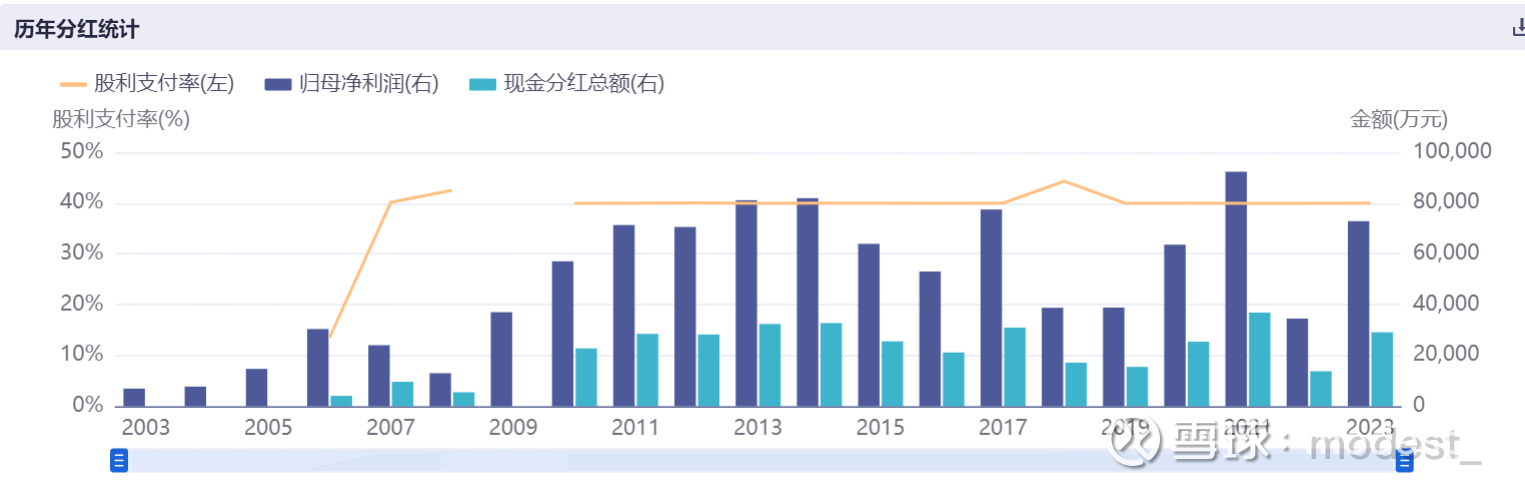 关于公司未来股息率的预期:上文已经提到了公司23年的净利润具有一定的代表性,预计未来的净利润将在23年的基础上波动,并小幅往上增长。又因为公司过去的派息一直挂钩的是归母净利润的40%,所以未来的股息率也是在目前7.7%的基础上波动,拉长维度,会有小幅的向上波动。