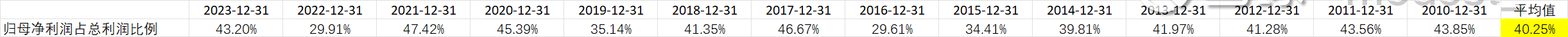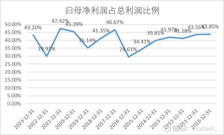 由于下属子公司具有较多外部股东,归属母公司净利润占到总利润的比例多年来平均值在40%左右(这个40%的比例后面将会运用来估算合并报表中,归属母公司股东的现金,自由现金流等数据)