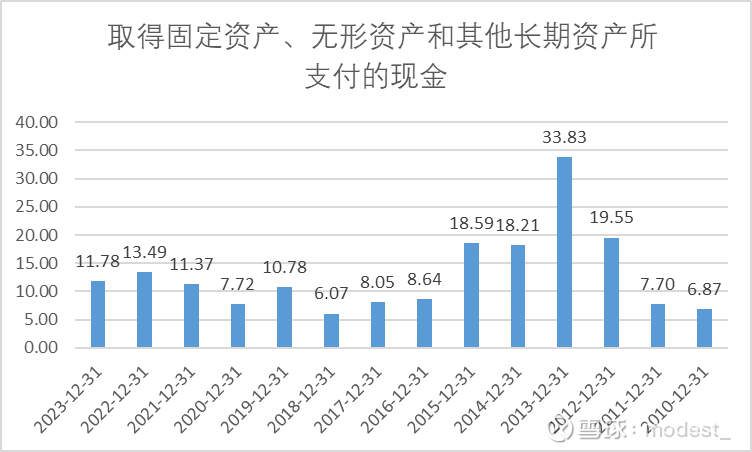 资本支出情况:资本支持的高峰是2013年的33.8亿元,2023年是11.8亿元,最近一些年都保持在10亿出头(对应40%母公司股东的资本支出大概是4亿元)。