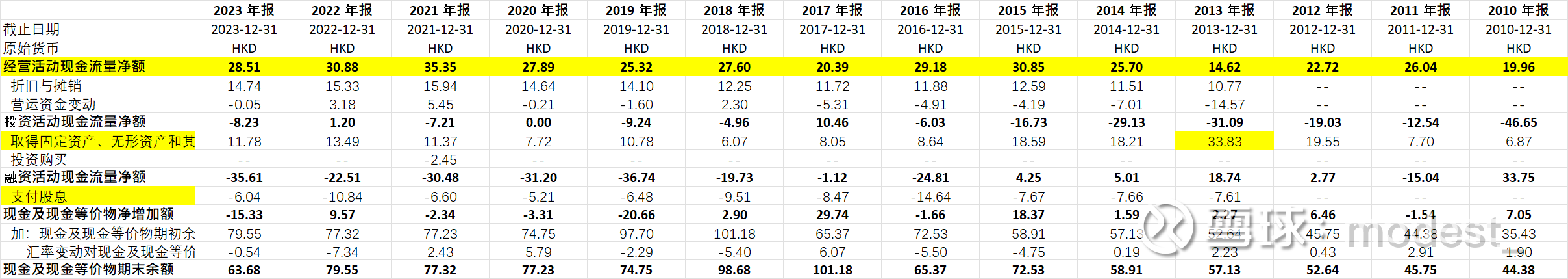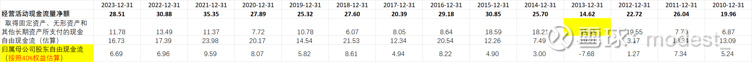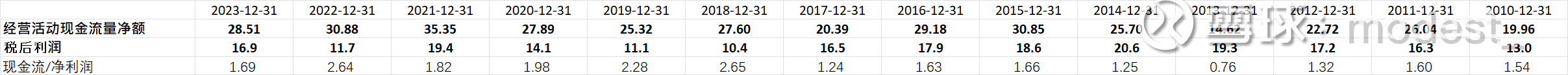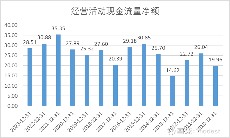 经营活动现金流量净额:23年为28.5亿元,最近一些年保持在30亿元左右。(但是注意,这里现金流量是合并报表的现金流。按照公司归母净利润占公司净利润40%的比例估算,归属于母公司股东的现金流大概是在10个亿左右)