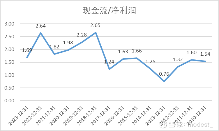 现金流/净利润:公司经营活动现金流除以净利润的比值23年为1.69,最近一些年大概比值在2左右。可以看到公司的现金流含金量还是比较高的。也很好理解,公司固定资产较大,现金流比净利润高主要是因为折旧导致的。