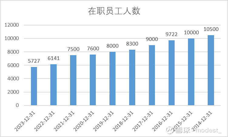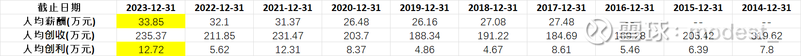 公司人数自2014年以来,每年都保持着稳步的下降,但人均薪酬逐渐增长, 2023年平均薪酬达到33.9万元,人均创利12.7万元。虽然公司整体薪酬和人数在下降,经营效率在变高,但是人均薪酬数据确实也比较高了。