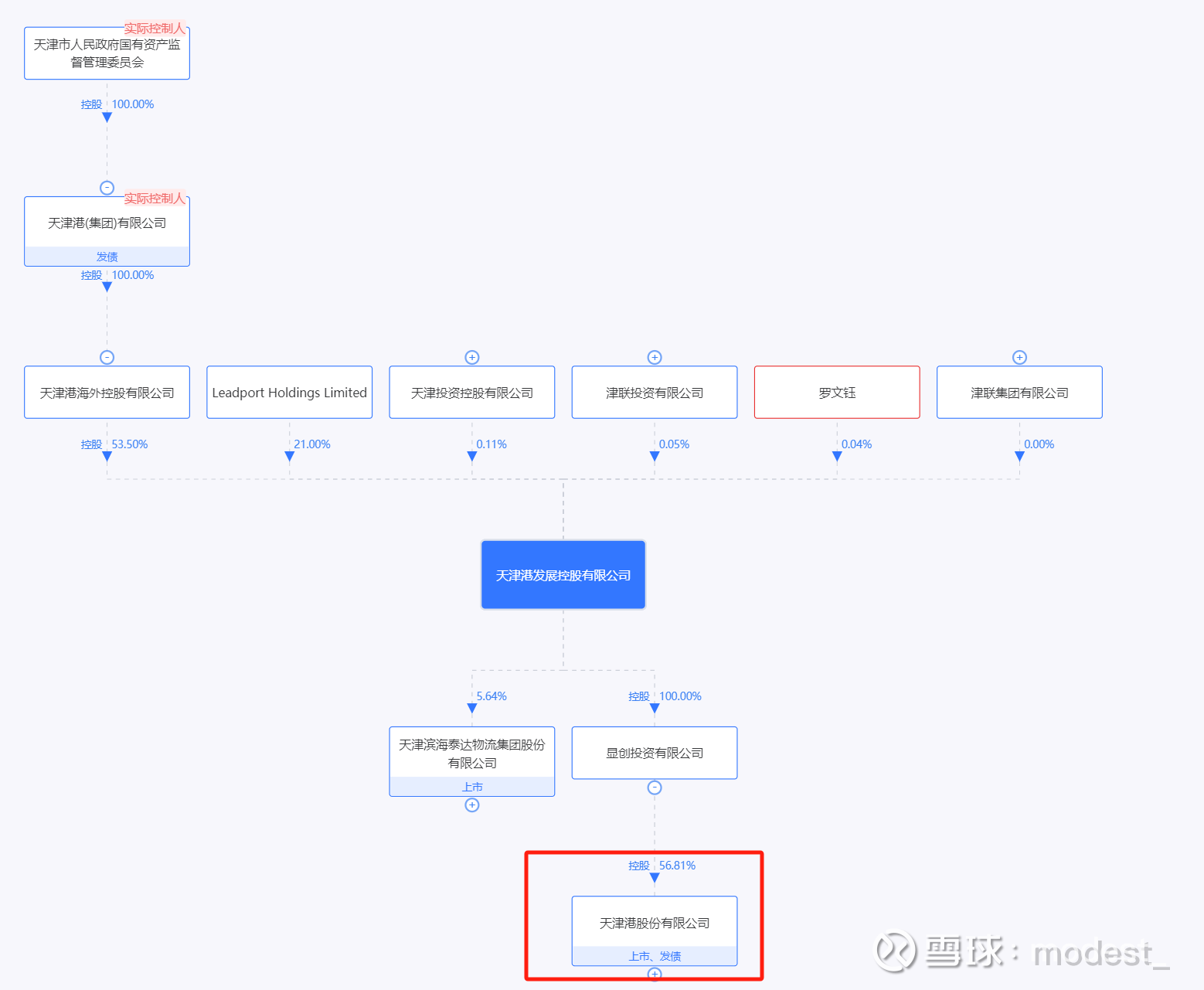 天津港发展实际控制人为天津市国资委,公司通过显创投资持有A股上市公司天津港56.8%的股份。