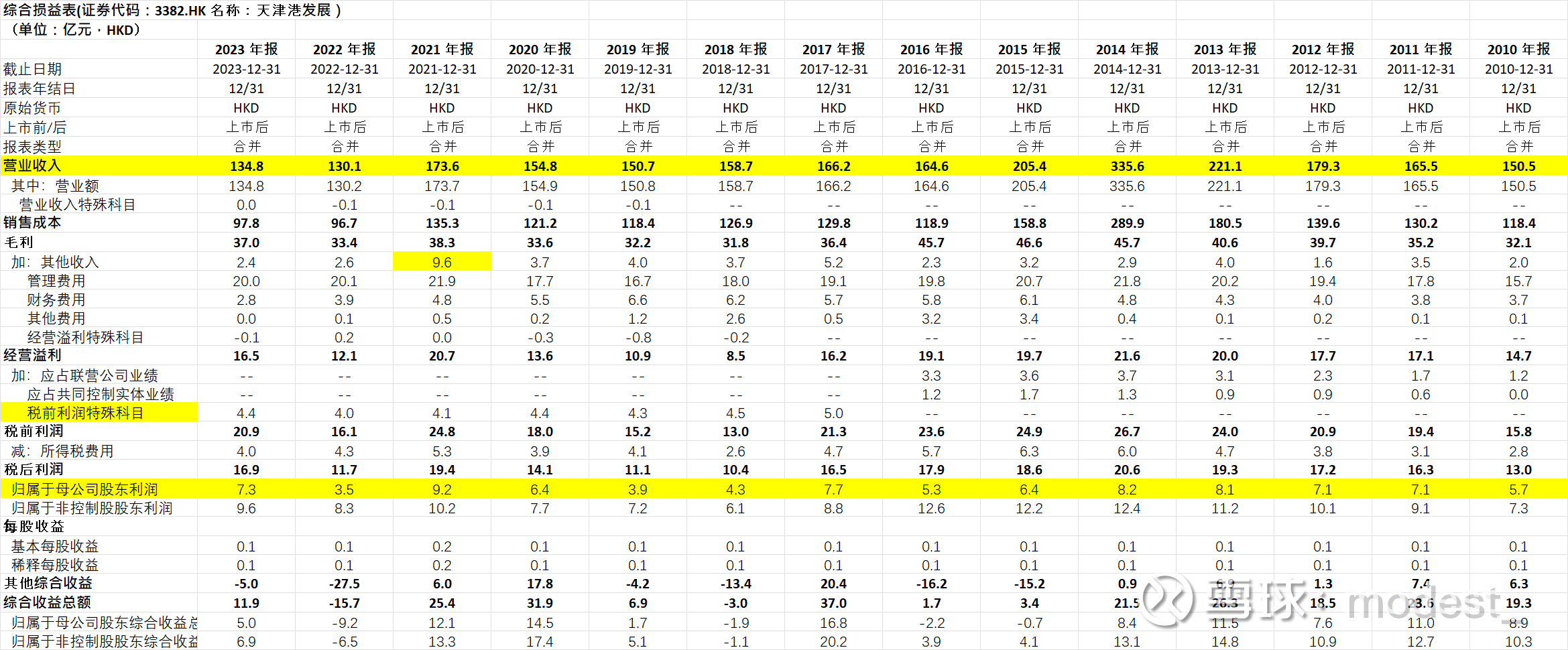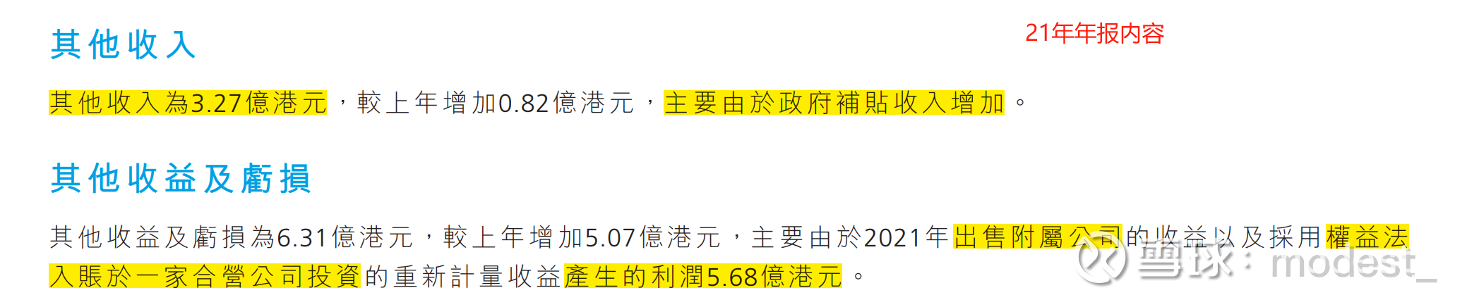 21年归母利润基数较高,主要因为当年政府补贴收入增加,以及出售公司以及权益法入账一家公司的收益5.68亿港元