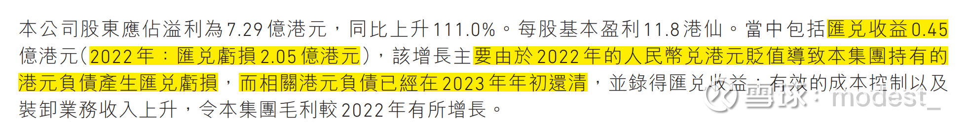 2022年归母净利润由21年的9.23亿元大幅下滑到22年的3.45亿元。主要因为22年汇兑亏损2.05亿港元 (2021年:汇兑收益0.58亿港元) ,汇兑亏损主要来自持有的港元负债因人民币兑港元贬值所产生(这个外币的负债在23年已经还掉了,所以未来不会再产生大额的汇兑亏损或者收益)。2022年,如果不计入汇兑差额的除所得税前溢利为18.11亿港元(2021年:24.18亿港元),同比下降25.1%。