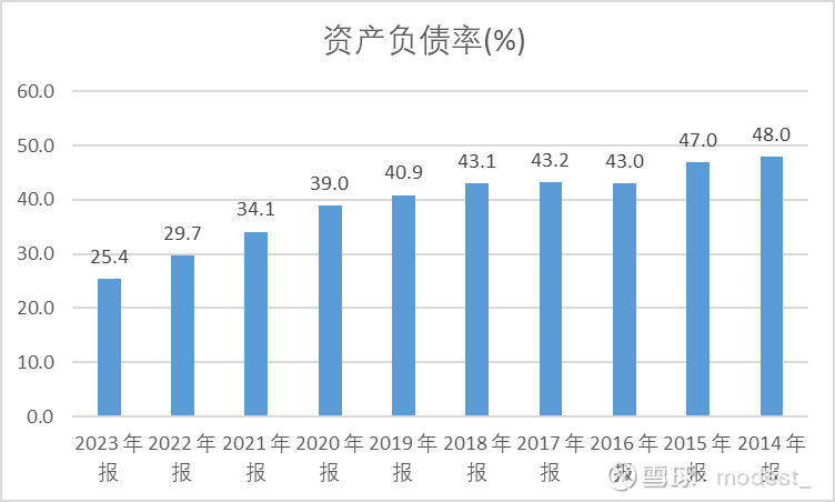 从资产负债率来看,最近10年呈现下降趋势,尤其最近五年,资产负债率从19年的40.9%快速下滑到了2023年的25.4%