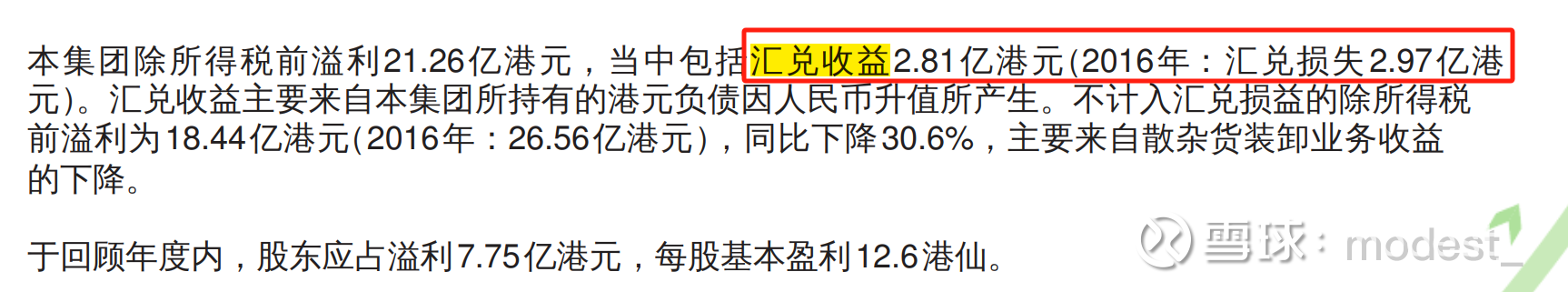 公司2017年的时候,也是一次归母净利润的高点7.7亿元,翻看2017年年报,主要因为当年拥有2.81亿港币的汇兑收益,而2016年的归母净利润5.3亿元(2015年为6.39亿元),2016年归母净利润下滑主要是当年汇兑损失2.97亿元。