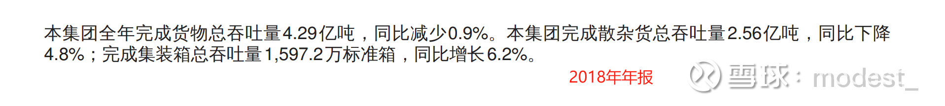 那么为什么2018年,2019年的利润又降低了这么多了?归母净利润由2017年的7.7亿元,下降到了2018年的4.3亿元。一是2018年报表解释因为汇兑亏损2.04亿港币。二是,2017年以后因为环保政策,煤炭不能汽车运输,导致公司散杂货的装卸业务量下降(下文有公司散杂货的数据图表),2018年的装卸业务收入合计下降1.7%(要不是其中的集装箱装卸同比增长8.7%,那么装卸业务会下滑更多),在收入下降的时候,成本却因为堆存费和倒运费,反而成本上升了6.7%。