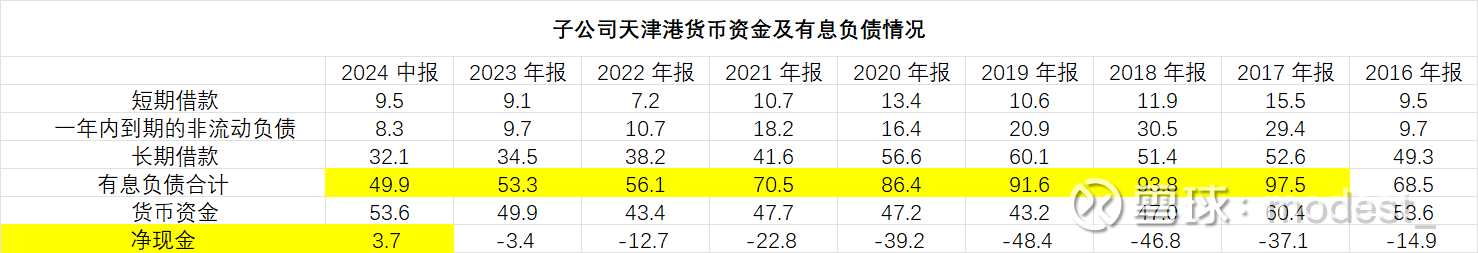 上文中披露的报表是合并报表,根据23年母公司报表,由于23年母公司偿还了美元贷款,账面货币资金由28亿元减少到5.8亿元,我们所看到的合并报表23年年末的63.9亿元,主要的现金在子公司天津港,母公司账面资金不足以支持高分红,主要子公司天津港未来分红增多后,母公司的派息能力会得到提高。观看最近一些年,子公司天津港的现金流也比较充沛。截止2024年半年报,账面货币资金53.6亿,对应的借款共计49.9亿元(短期借款+长期借款+一年内到期的非流动负债合)。