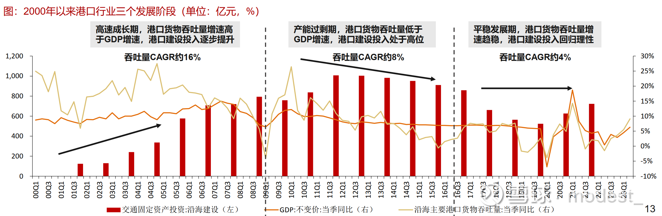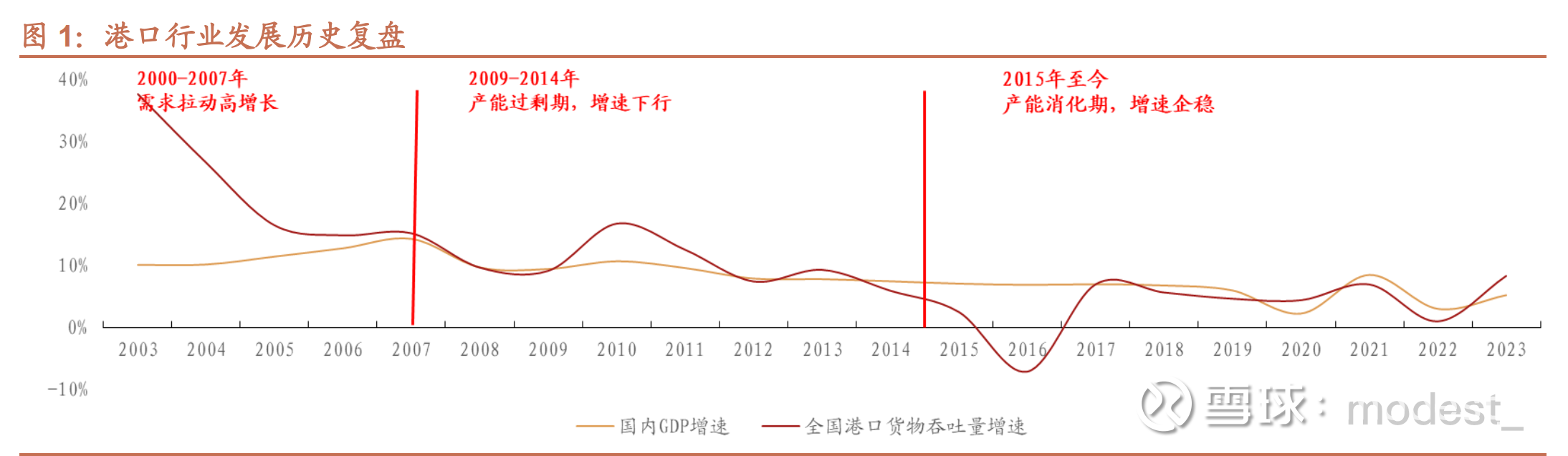 过去二十年,全国港口货物吞吐量增速与 GDP(不变价)增速保持相对一致。 随着改革开放的推行及国际航运市场的发展,我国港口行业建设进入新的发展高潮,至 1997 年底基本形成了以二十个枢纽港为骨干,地区性重要港口为补充的分层次港口布局。 2000 年后,我国港口行业共经历三个发展阶段