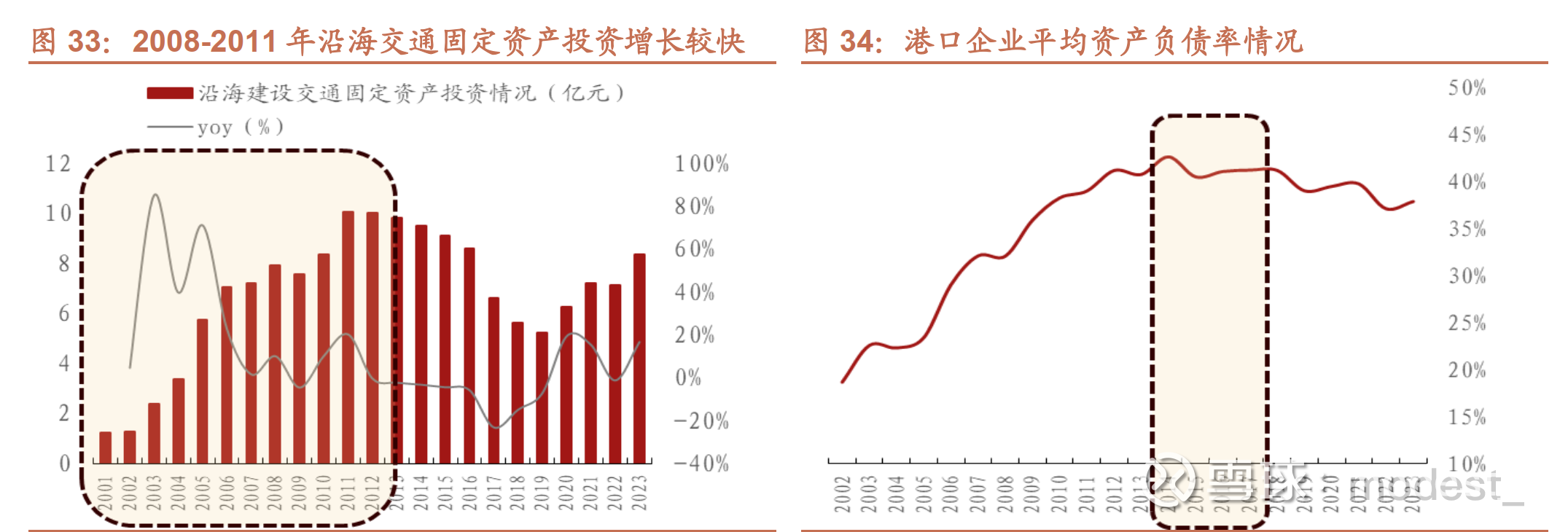 阶段一: 2008 年前伴随经济增长,港口产能建设加速进行,沿海交通固定资产投资额增长明显。 01-08 复合增速达 30.3%, 2008 年,港口企业平均资产负债率水平增长至 32.1%。