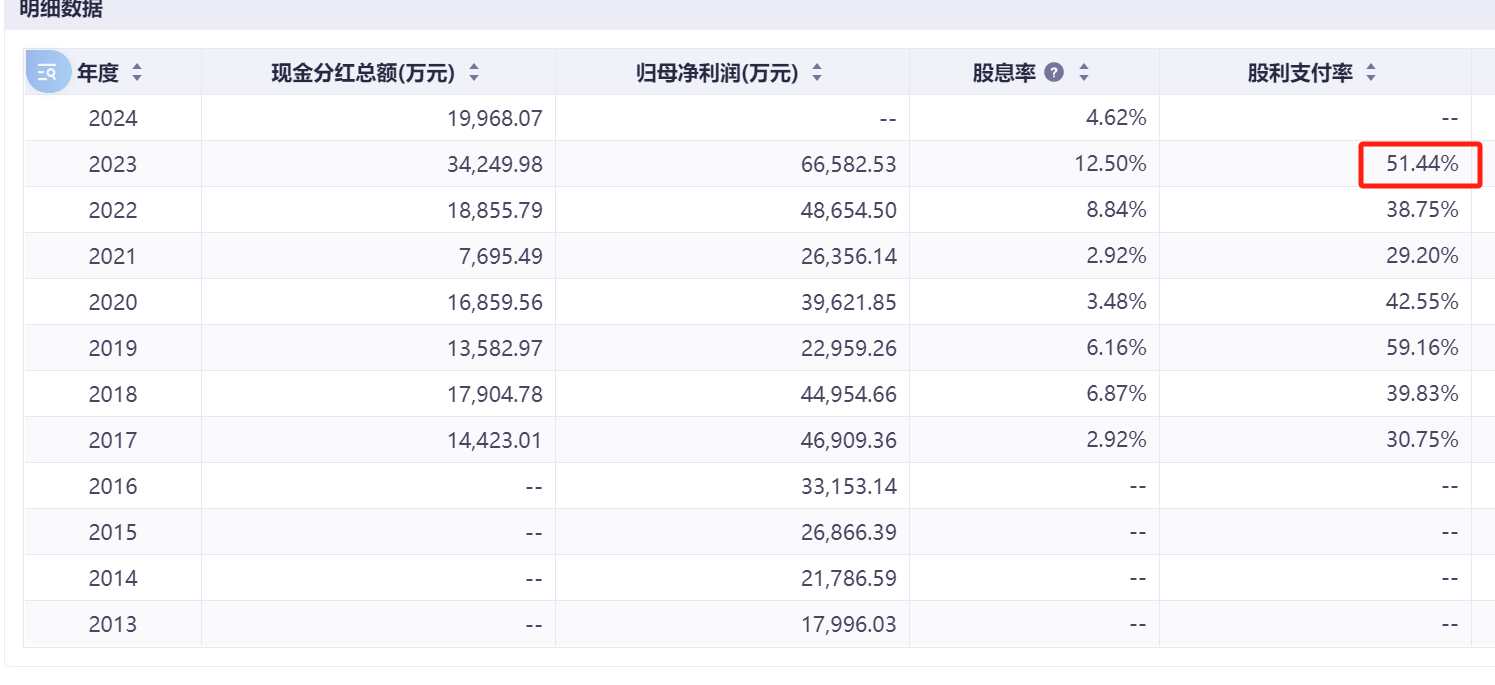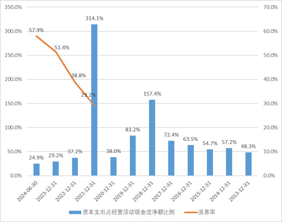 从下图可以看出,随着资本支出占经营活动现金流的比例逐步降低,公司的派息率逐步提高,从2021年的29.2%提高到2024年半年度的57.9%