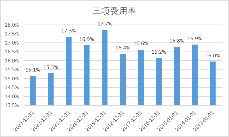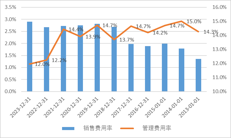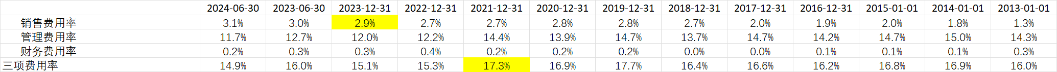 公司费用率保持在15%-18%之间,最近两年费用率下降,22年的费用率为15.1%,拆开费用率结构来看,管理费用率逐步从15%降低到12%附件,而销售费用率逐步增加到接近3%的水平。