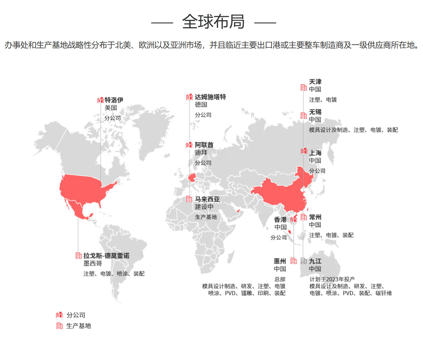 公司总部在惠州,国内生产基地包括惠州,天津,无锡,常州,九江。海外包括马来西亚和墨西哥。