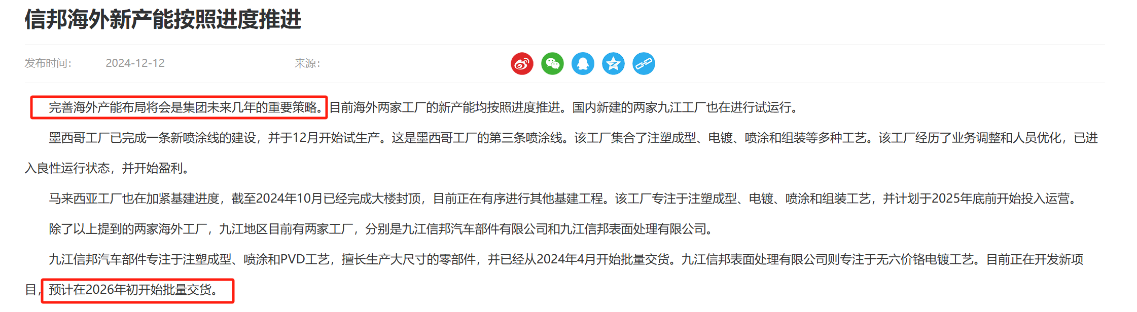 根据公司2023年年报显示,公司2023年完成了九江基地的建设,但是目前只有注塑产品交货,电镀产品预计在2026年才会交货。