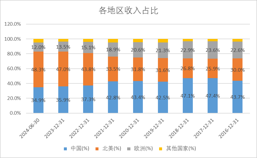 截止2023年公司收入占比最大的为北美地区,占比达到47%,虽然中国地区的收入在增长,但由于北美地区增长更快,中国区收入变向降低到36%左右(24年H1进一步降低到34.9%)。观察北美地区收入,可以发现在2022年快速的增长,由2021年的7.8亿元增长到2022年的12.6亿元,同比增长61.6%。北美地区增长迅速,主要是因为墨西哥工厂的贡献。北美地区当年销售产品,平均单价同比增长40%以上。