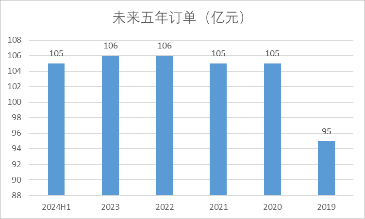 公司在手订单充裕,截止2024H1,未来五年需要交付的订单还有105亿元。2020年之后在手订单没有什么增加,与公司收入变大,交付变多也有一定关系。