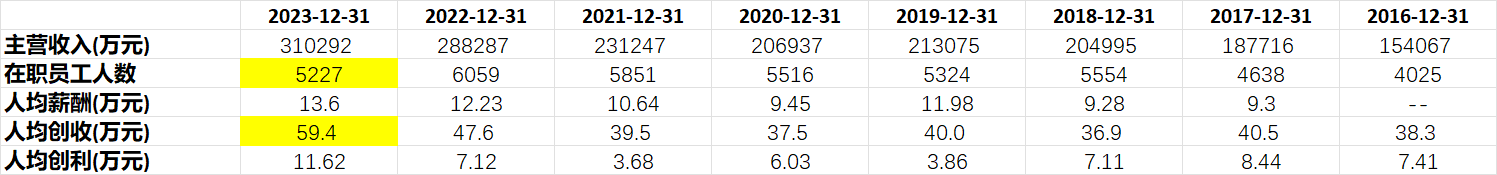 下表是公司的人效数据,可以看到,公司收入增长,但是员工人数却在减少。2023年仅5227人,人均创收从21年的39.5万元,增加到23年的59.4万元。人均创利在23年也达到新高的11.6万元。